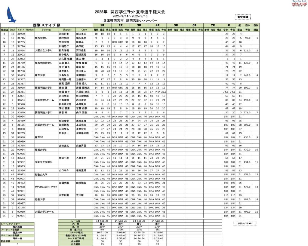 スナイプ級は、トップホーンを本日2回鳴らした赤松佑香/植田兼斗(関西大)をはじめ、2艇が20点台でまとめた関西大Aが暫定トップに立ちます。その背中を23点差で大阪公立大Aが追います。