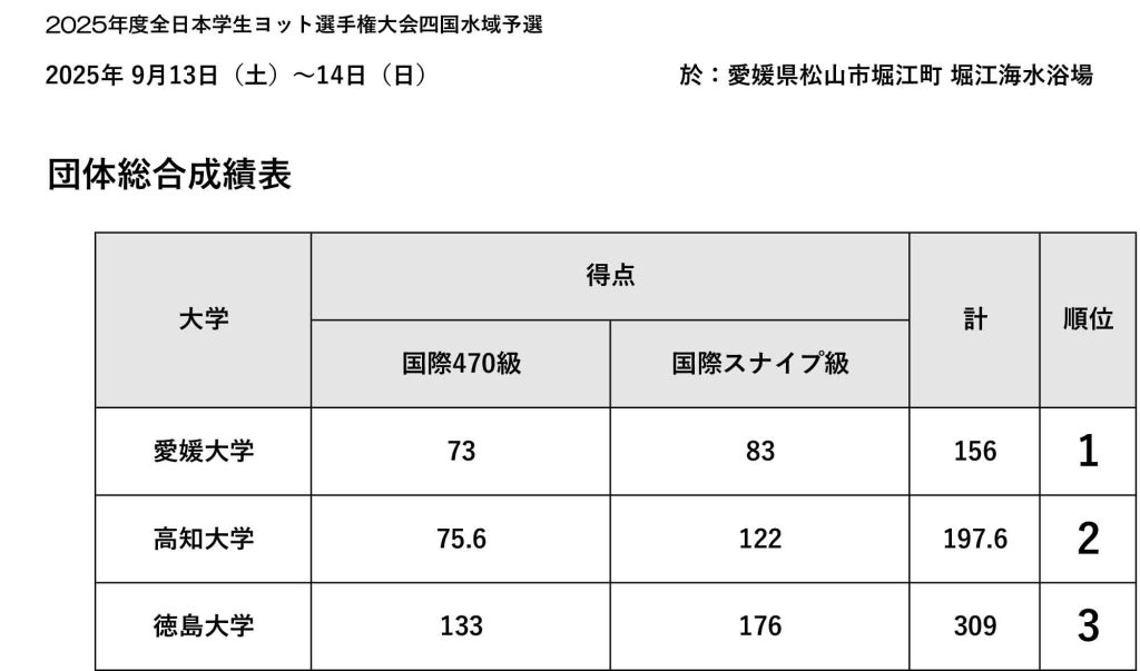 9月13、14日、愛媛県松山市で「2025年度全日本学生ヨット選手権・四国水域予選」が開催されました。レースは2日間で6レースが行われ、愛媛大学が470、スナイプともに優勝し、全日本学生ヨット選手権の出場権を獲得しました。(BHM編集部)