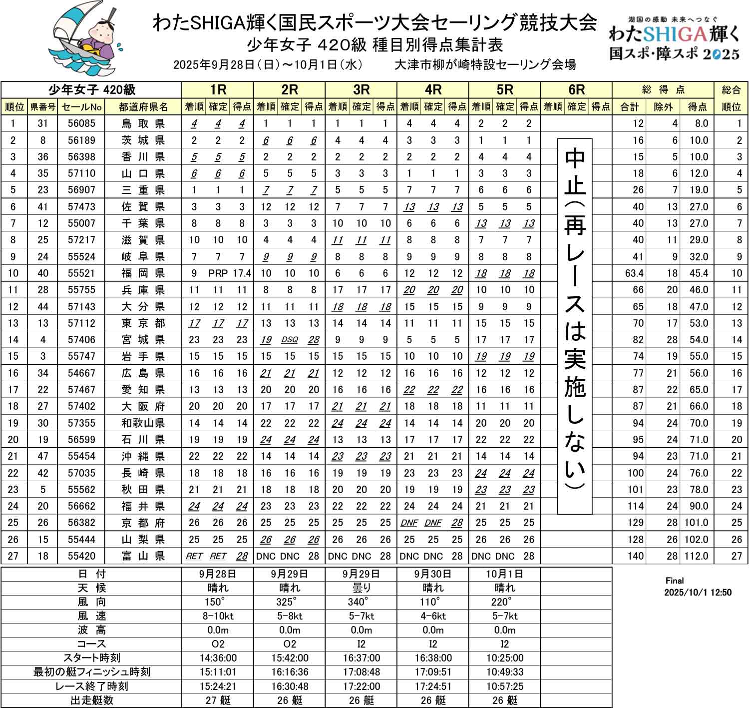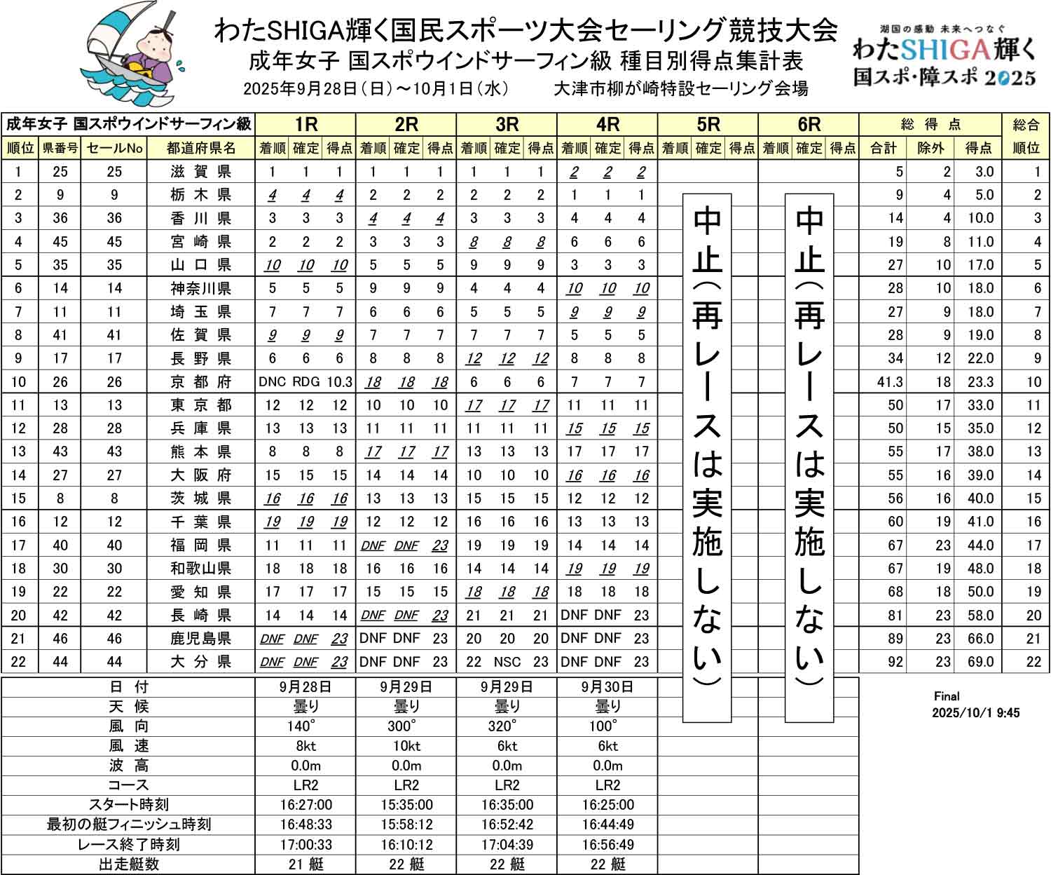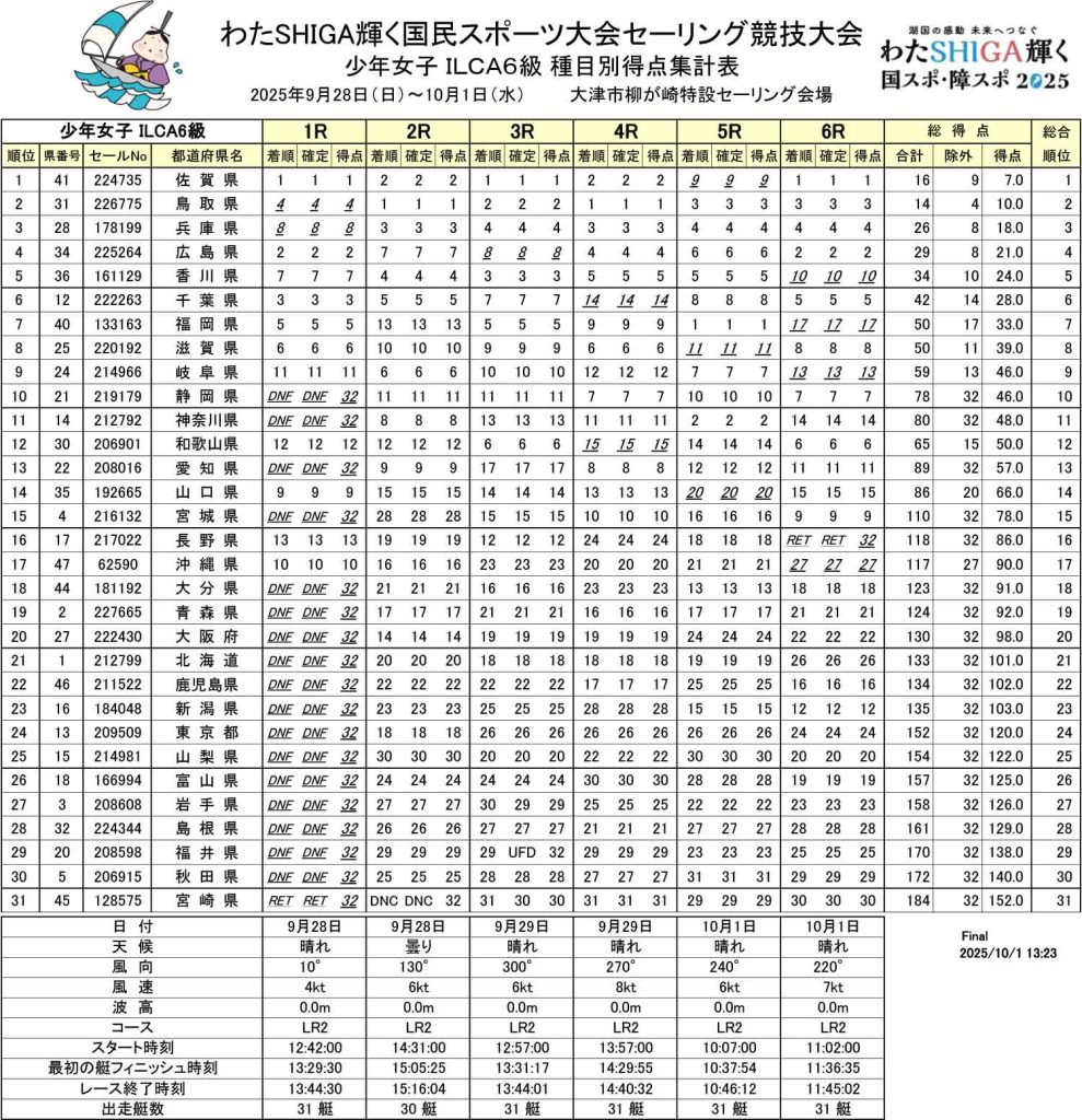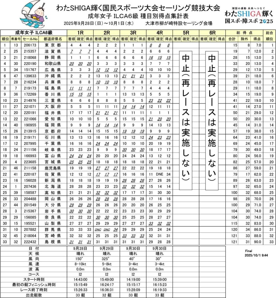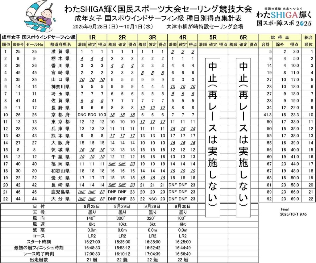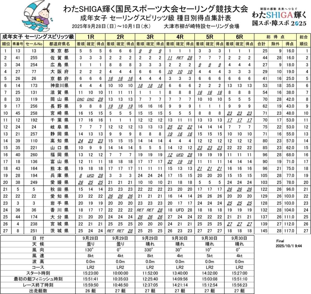9月28日〜10月1日まで大津市柳が崎特設セーリング会場で開催された「わたSHIGA輝く国スポ 第79回国民スポーツ大会」の成績です。男女総合の天皇杯は鳥取県、女子の皇后杯は佐賀県が獲得しました。(BHM編集部)