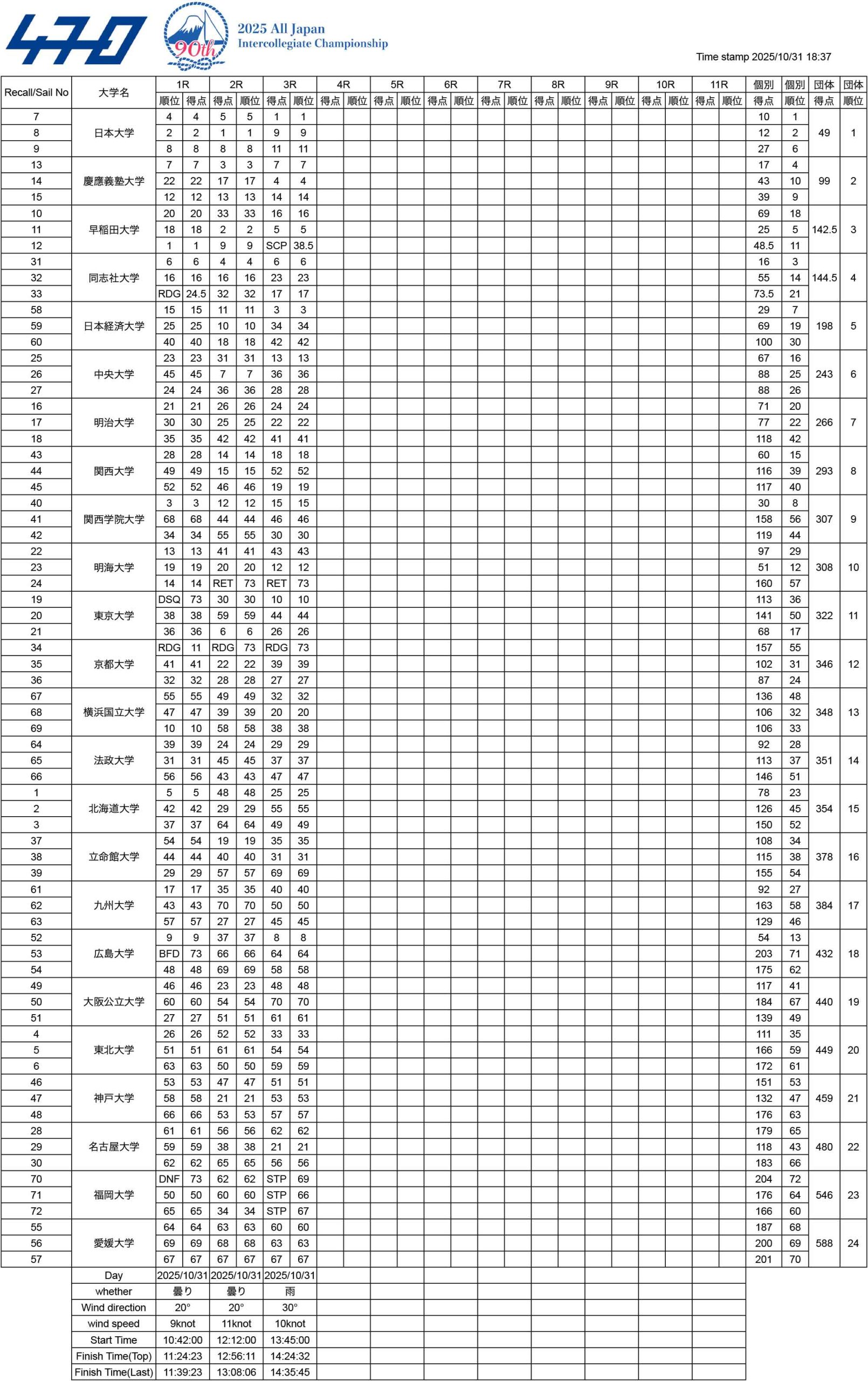 第1レースの470級は早稲田大の重松/松山がトップホーンを鳴らしましたが、残りの2艇が続けず。日本大は初日の3レースで上位成績を連発し、2位以下に大きく差を広げました。