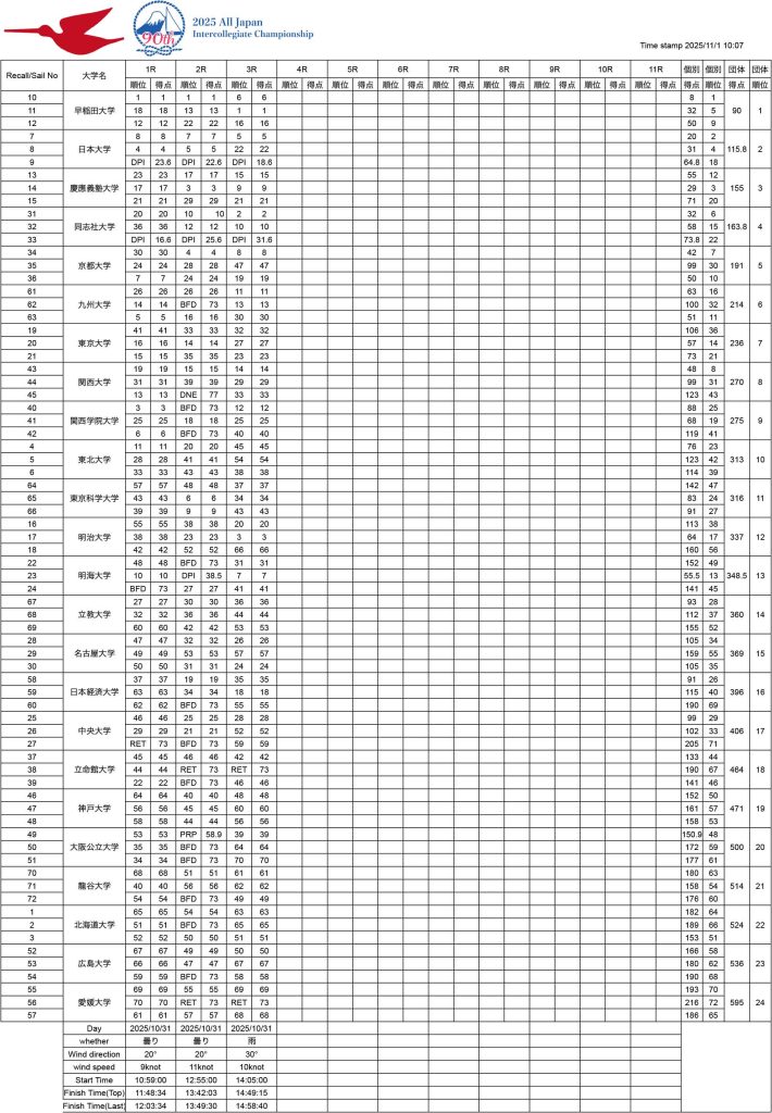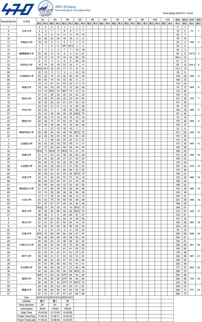 470級は初日に続き日本大が上位でフィニッシュします。その後ろに早稲田大が入り、一歩、日本大に近づきました。スナイプ級はスタートするものの、風向が大きく変わりノーレースとなりました。スナイプ級は初日から順位に変動はありません。