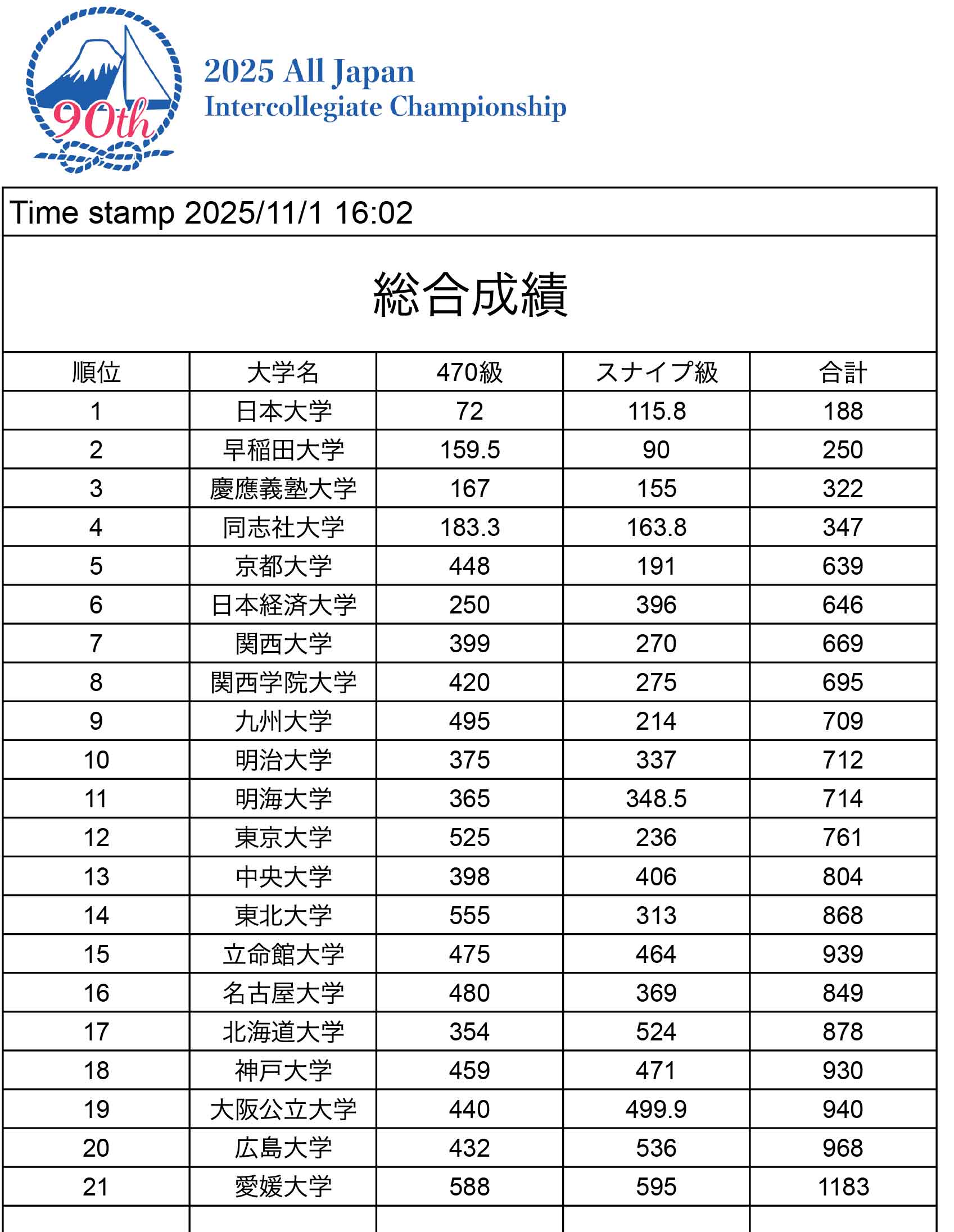 470級は初日に続き日本大が上位でフィニッシュします。その後ろに早稲田大が入り、一歩、日本大に近づきました。スナイプ級はスタートするものの、風向が大きく変わりノーレースとなりました。スナイプ級は初日から順位に変動はありません。