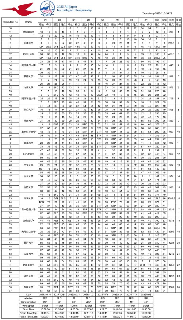 序盤は日本大が首位に立ち、3日目に早稲田大が逆転。最終日に日本大が再度逆転するという名勝負で90回目の全日本インカレは幕を閉じました。来年の舞台は西宮です。来年はどんな風が吹くでしょうか? 次は西宮で会いましょう!