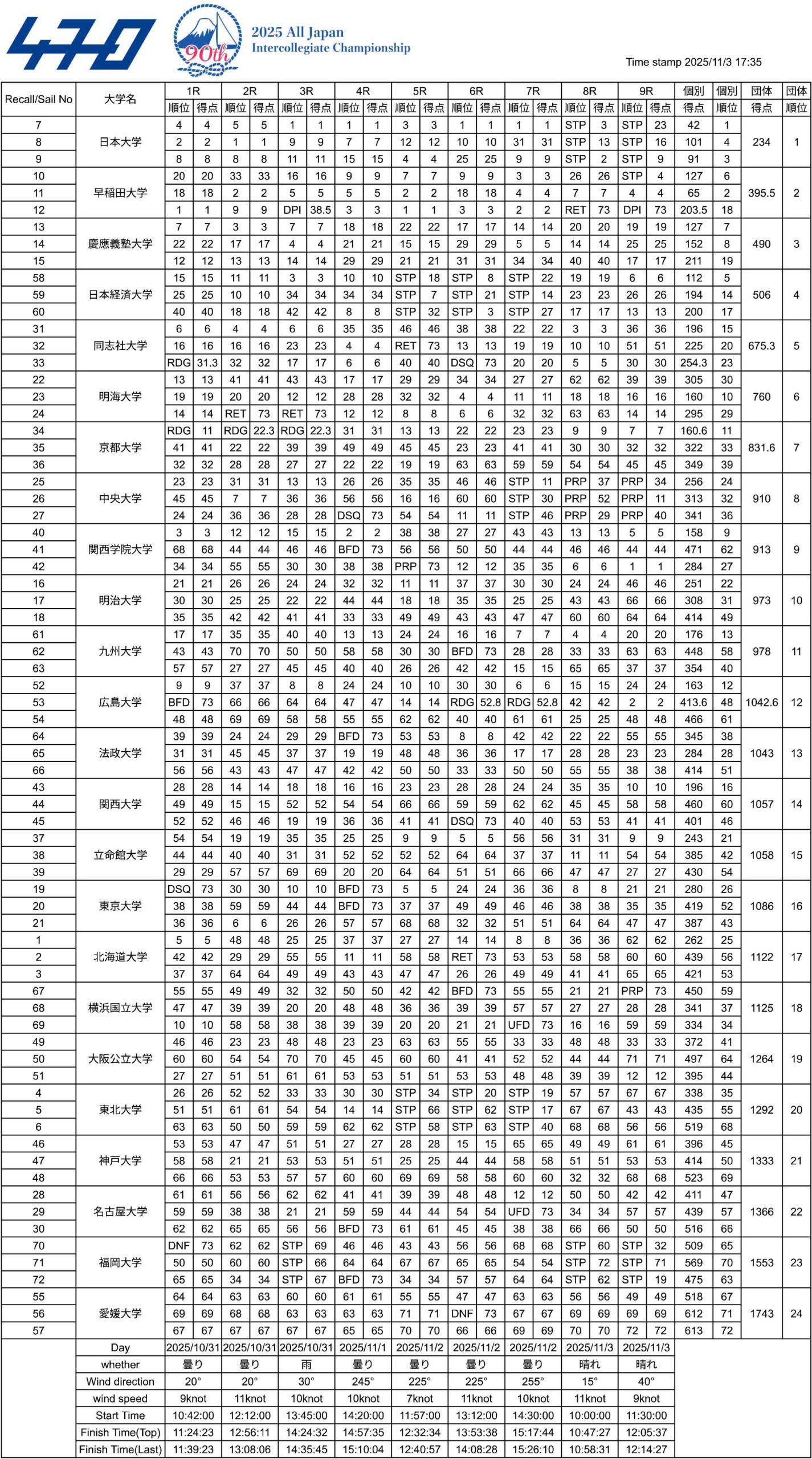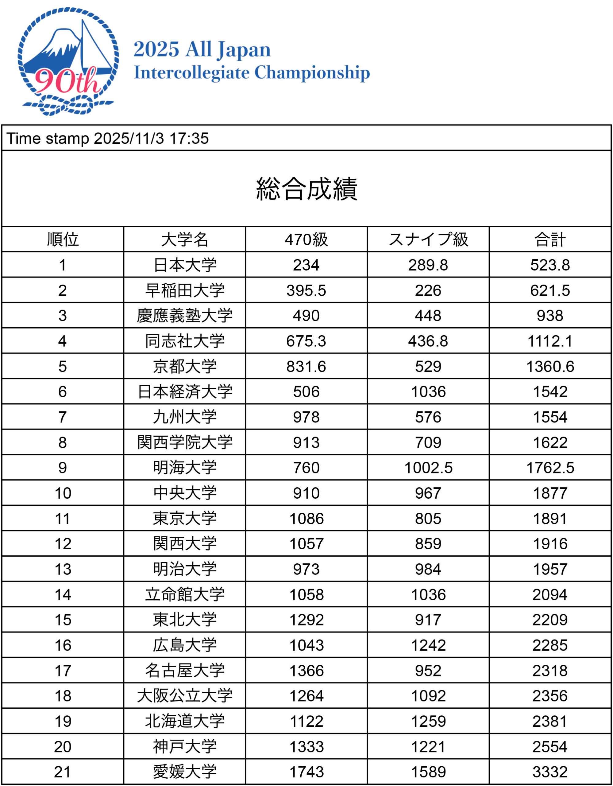 序盤は日本大が首位に立ち、3日目に早稲田大が逆転。最終日に日本大が再度逆転するという名勝負で90回目の全日本インカレは幕を閉じました。来年の舞台は西宮です。来年はどんな風が吹くでしょうか? 次は西宮で会いましょう!
