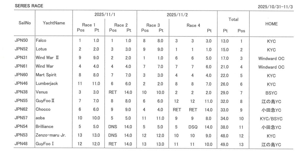 10月31〜11月3日の4日間、新西宮ヨットハーバー沖で関西ヨットクラブ、新西宮ヨットハーバーの共催による「第52回ドラゴンクラス選手権2025」が開催されました。今回は江の島フリート、琵琶湖から5チームのエントリーがあり、これまで最大の計13艇のレガッタとなりました。(レポート・写真提供/日本ドラゴン協会)