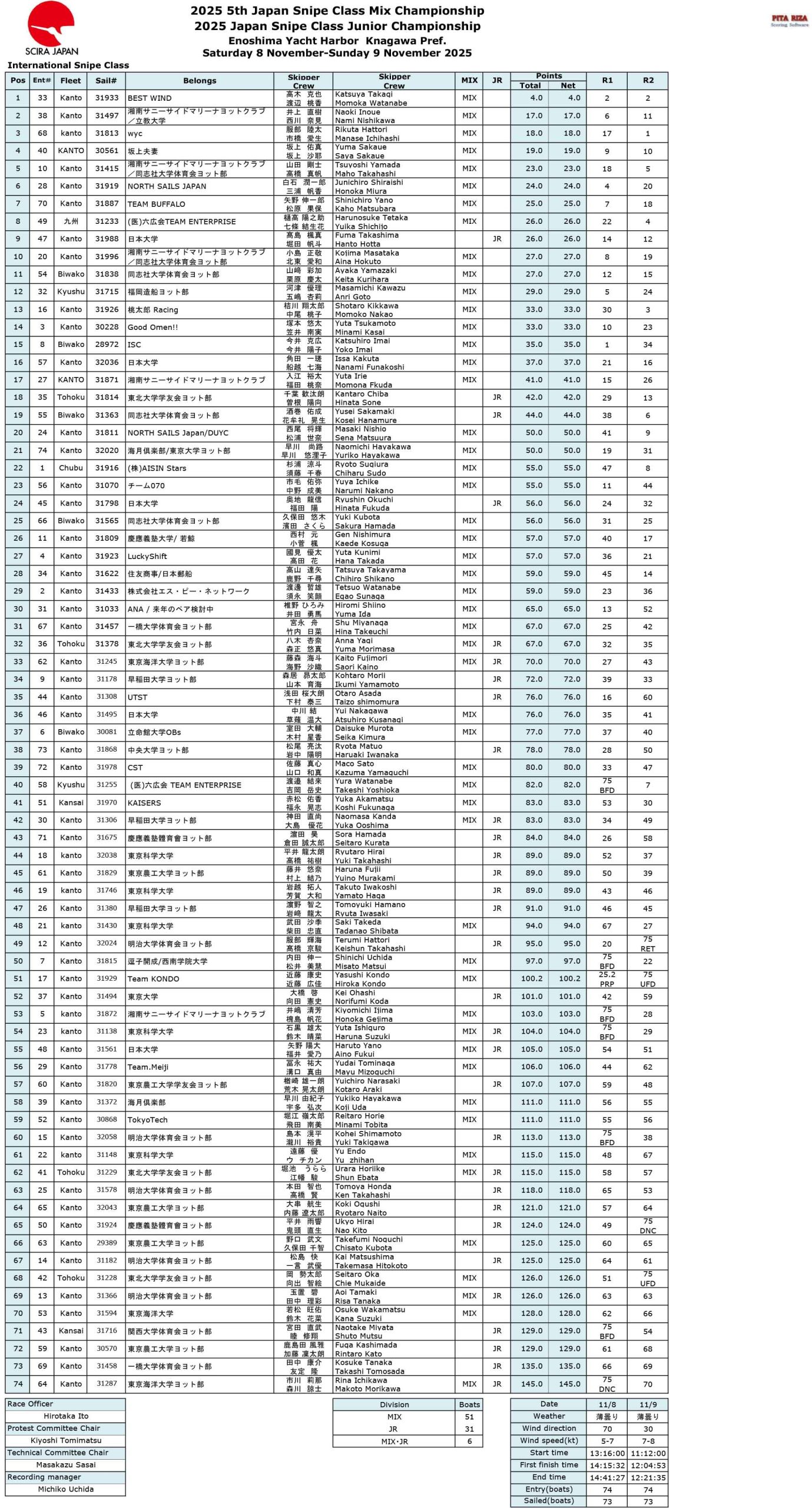 11月8、9日、江の島で開催された「第5回全日本スナイプ級ミックスヨット選手権」「全日本スナイプ級ジュニアヨット選手権」の成績です。参加74艇。大会は2日間ともに風が弱く、2レースのみ行われました。ミックス全日本は既定レース数に届かずレース不成立。ジュニア全日本は髙島楓真/堀田帆斗(日本大)が優勝しました。(BHM編集部)