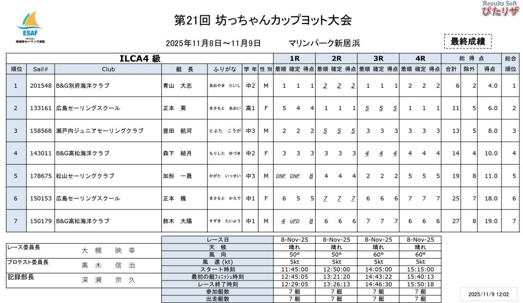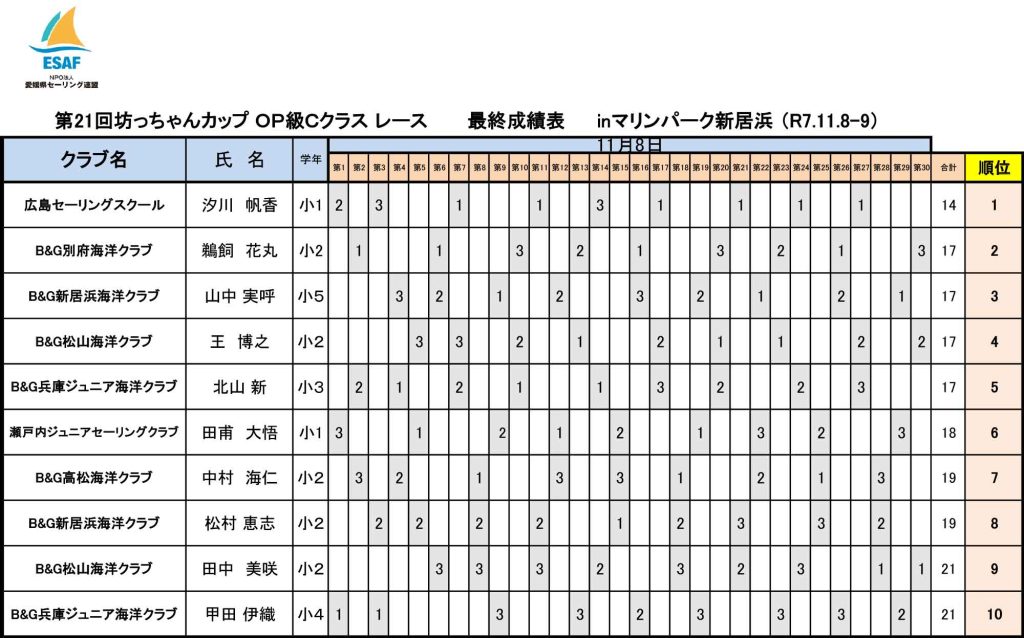 11月8日、9日、愛媛県新居浜市のマリンパーク新居浜で「第21回 坊ちゃんカップ ヨット大会」が開催されました。全国各地より、ILCA4級7艇、OP級Aクラス23艇、OP級Bクラス27艇、OP級Cクラス10艇、合計67艇がエントリーしました。(レポート・写真提供/NPO法人 愛媛県セーリング連盟 深瀬宗久)