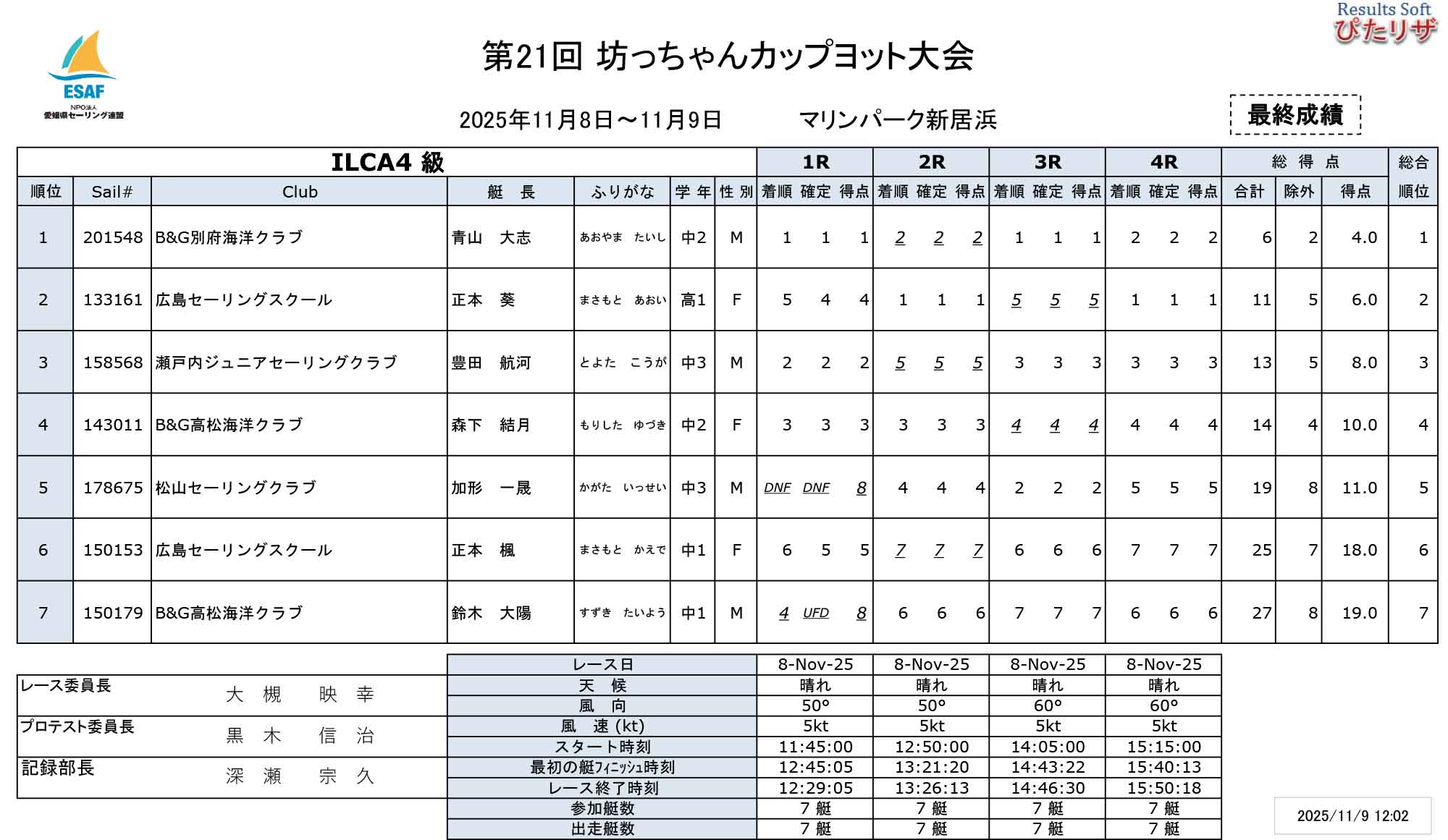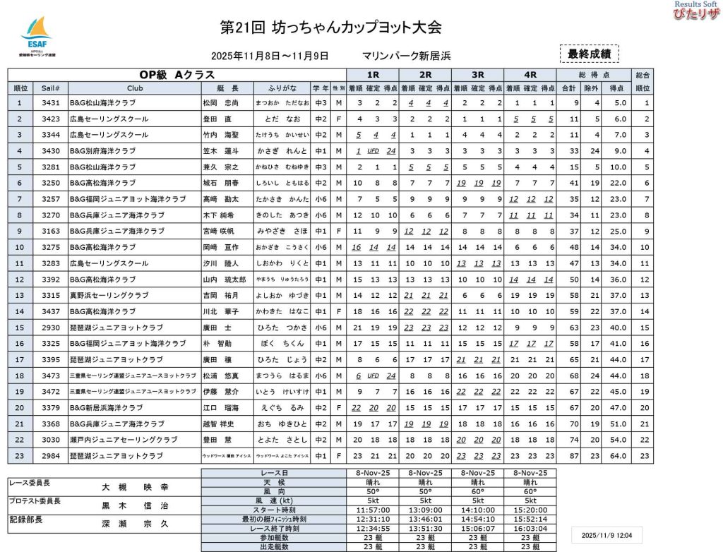 風は、5~6ノットの北東風で、1日目は、ILCA4級、OP級Aクラス、OP級Bクラスは、4レース、OP級Cクラスは、30回戦行いました。2日目は、朝からあいにくの雨で無風状態。お昼ごろまで風待ちをしましたが、ノーレースとなりました。1日目の結果をもって、シリーズが終了しました。