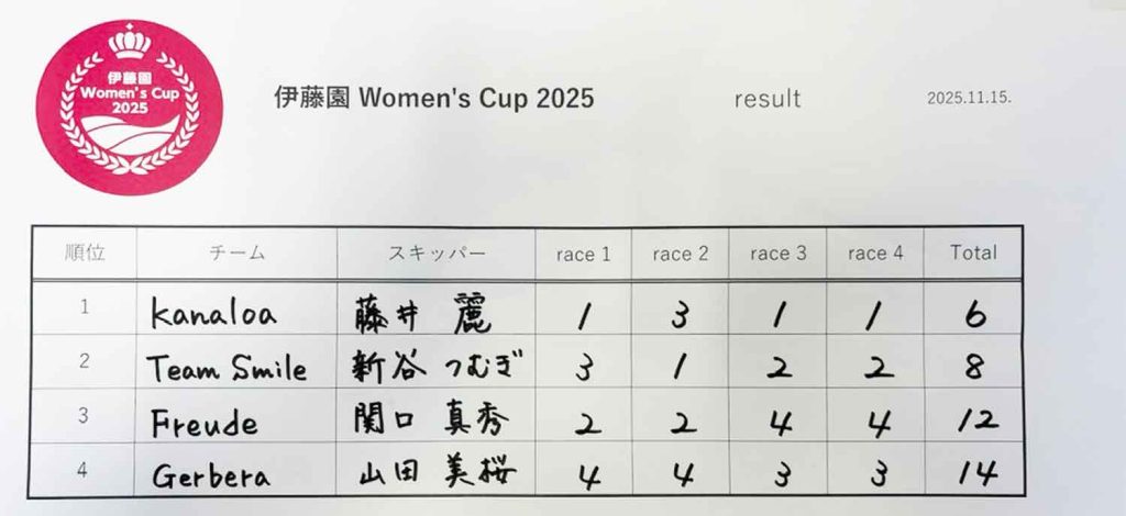 11月15日、葉山マリーナで開催された女子キールボートレース「伊藤園 Women’s Cup 2025」の成績です。参加4チーム。4レース行われ、優勝は藤井 麗、川西由美子、関根夏海、波田地由佳、山下美香、大坪苗子、矢口梨絵 が乗り込んだ〈Kanaloa〉でした。(写真提供/田口裕介、Women’s Cup 実行委員会)