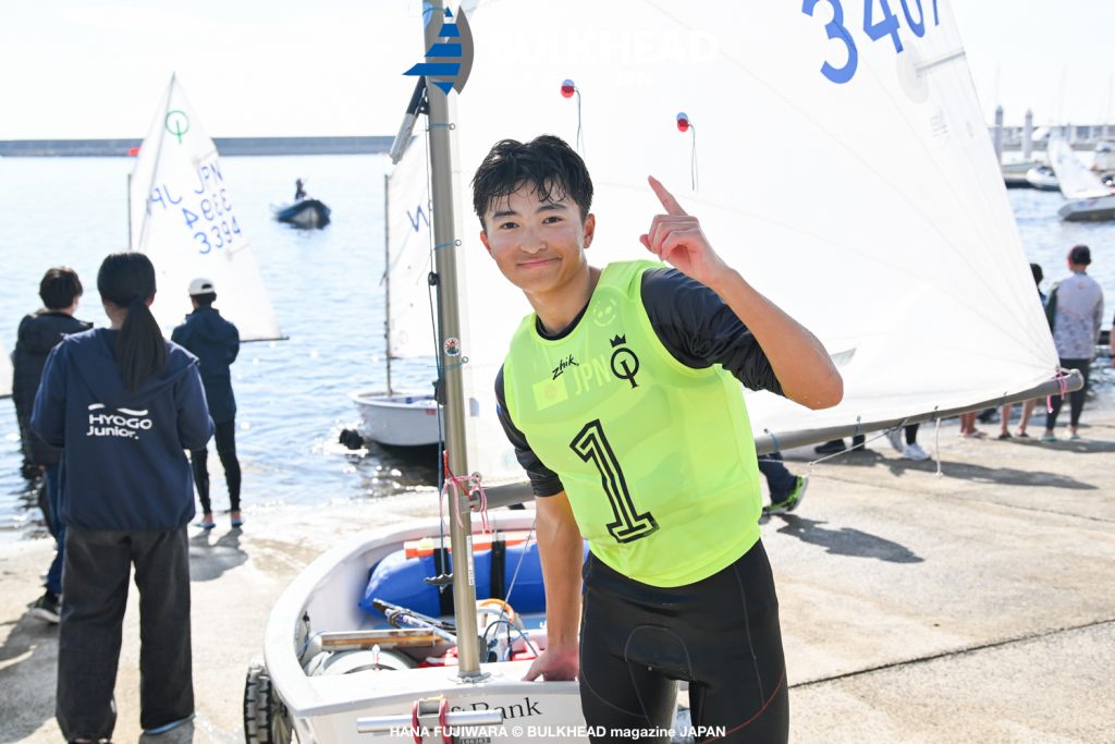 ラストイヤーで2年ぶり、自身2度目の優勝を飾った藤田翔伊(ふじた・しょうい)。「去年は2位で悔しい思いをしたので、もう一度優勝できてうれしいです。自分の強みを出せる南寄りの風でした。これからは420級で世界選手権の表彰台にのぼることが目標です」
