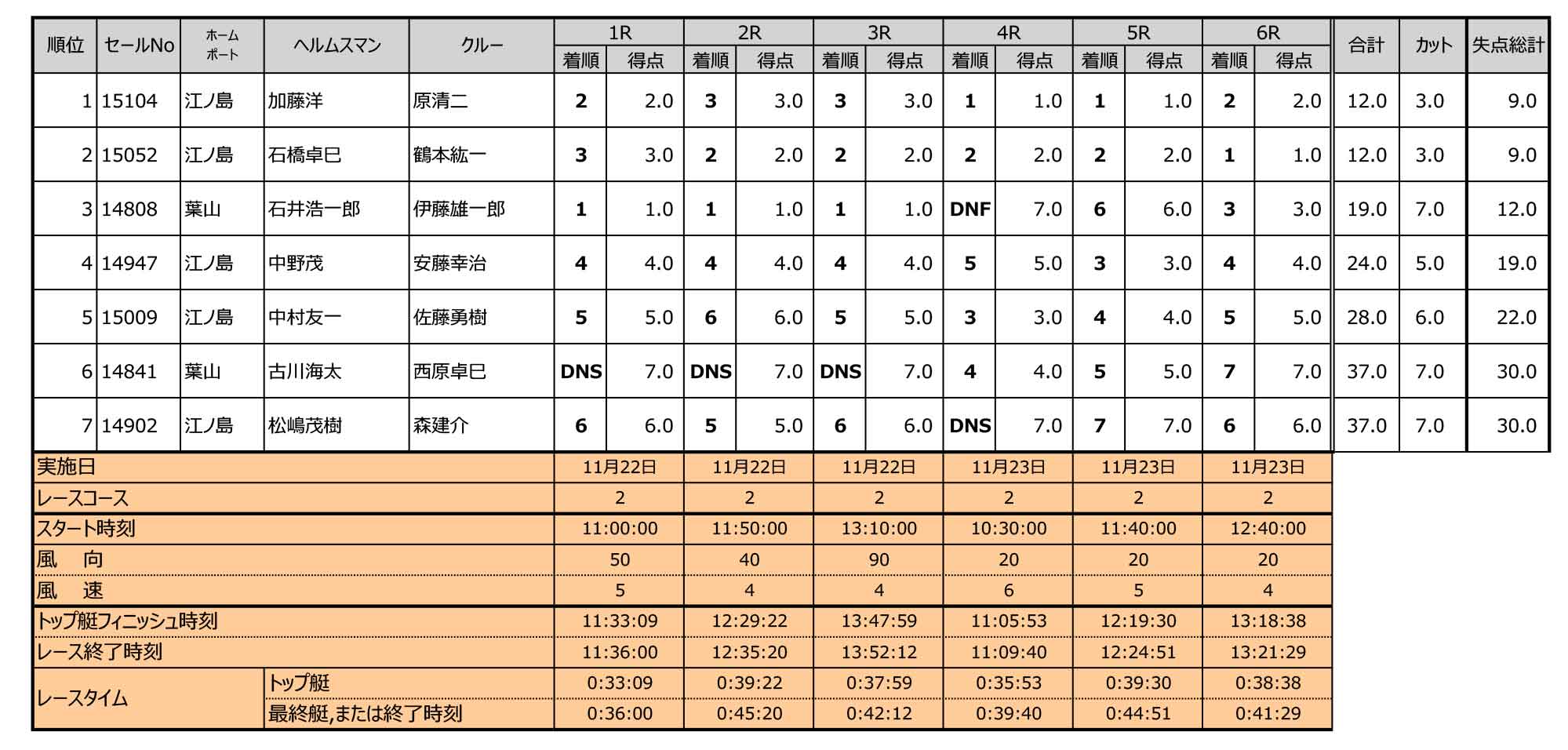 11月22、23日、江の島で「ファイアーボール級全日本選手権」が全7艇の参加で開催された。昨年North Sail社製のセールを導入し、初めて全日本選手権を制した石橋/鶴本に対して、加藤/原、石井/伊藤、中野/安藤が、石橋/鶴本の2連覇にストップをかけるかが注目された。(レポート・写真提供/日本ファイアーボール協会)