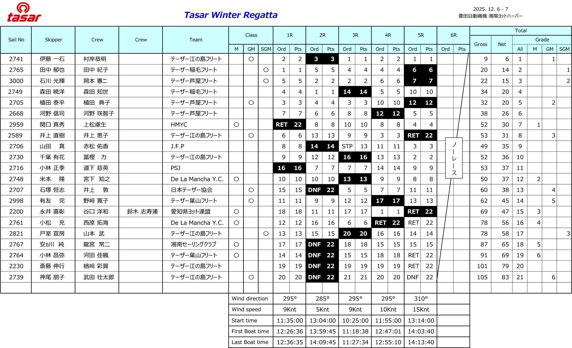 最終成績では、今年のJTA公式戦4勝目となる伊藤/村岸組が総合・グランドマスタークラスで優勝を果たしました。また、田中/田中組が総合2位・スーパーグランドマスタークラス優勝、関口真秀/上松慮生組(HMYC)がマスタークラス優勝となりました。なお、本大会の結果により、伊藤/村岸が2025年のテーザー・オブ・ザ・イヤーとなりました。