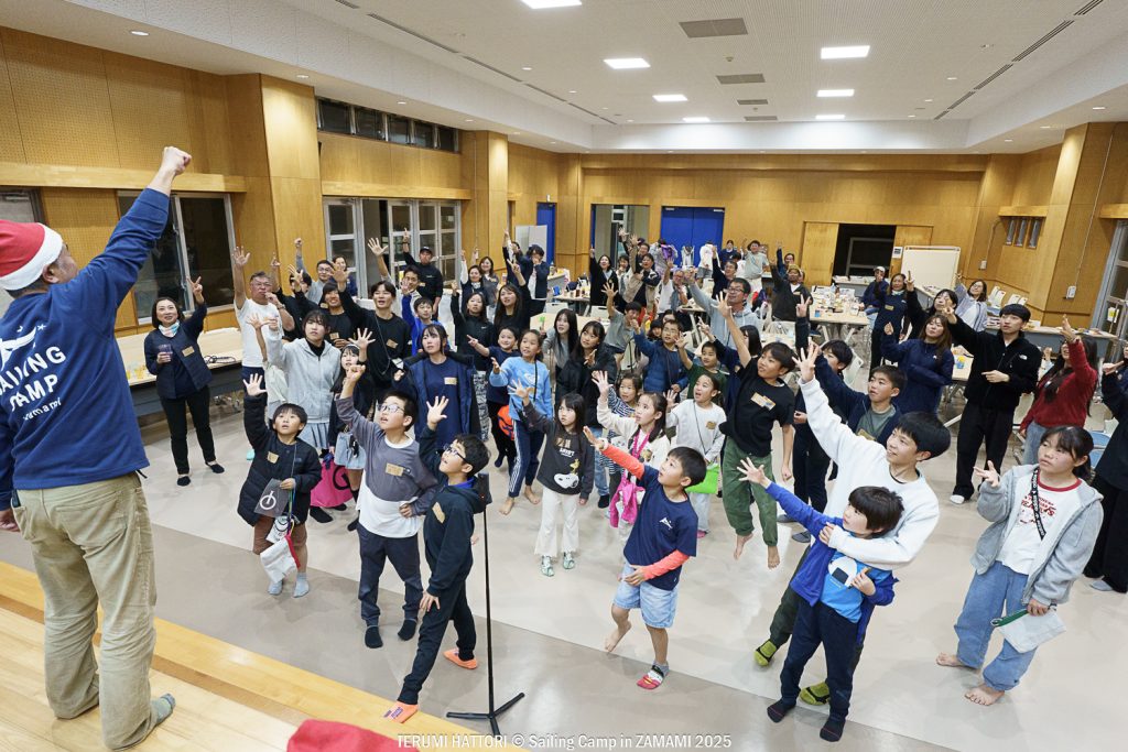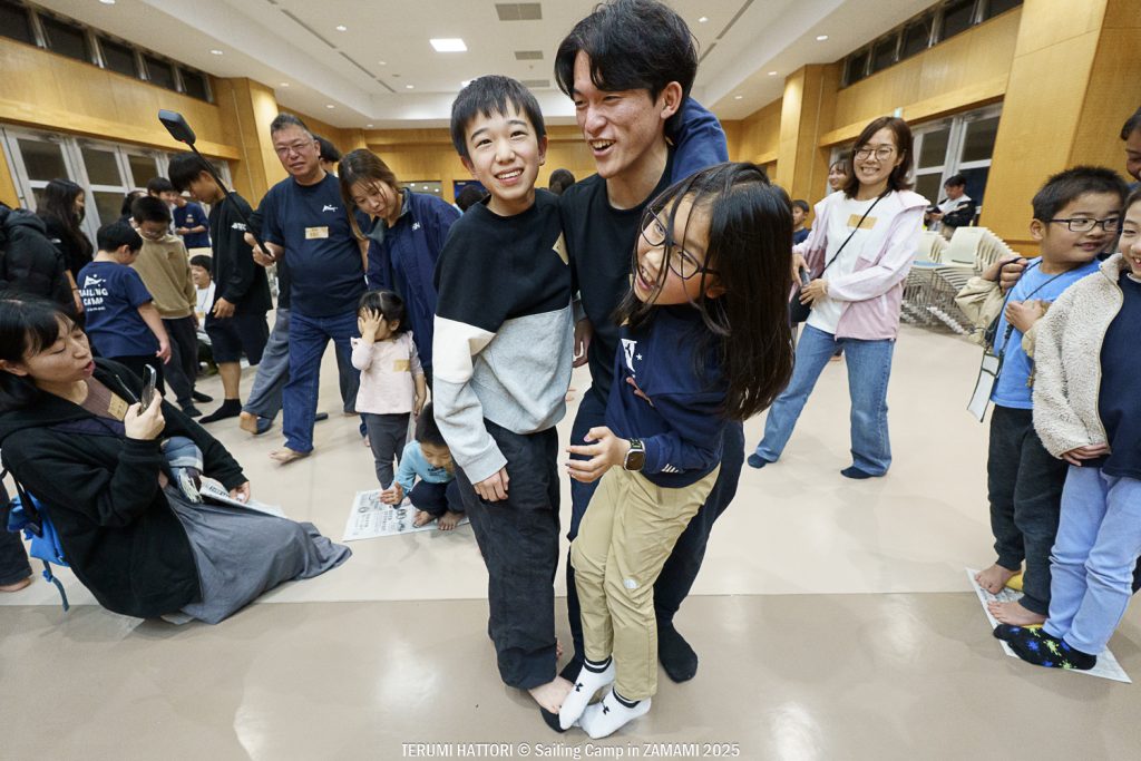 セーリングキャンプ in 座間味では、小1から中3までの子どもたちが6チームに分かれ、全体としては親御さんたちも含めた幅広い世代が参加します。その中で子ども、大人に関わらず全員が本気で海を楽しんでいる姿がとても印象的です。