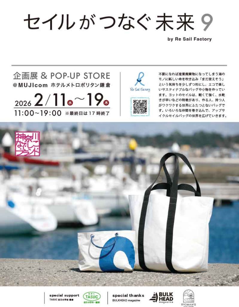 2月11日〜19日まで、Re Sail Factoryによる「セイルがつなぐ未来 9」が開催されています。古いセールをアップサイクルでバッグや小物に生まれ変わった商品の展示販売ほか、バルクヘッドマガジンも写真展示で参加しています。場所は鎌倉駅からすぐ。鎌倉MUJIcom ホテルメトロポリタン鎌倉です。みなさん、ぜひお越しください。(BHM編集部)