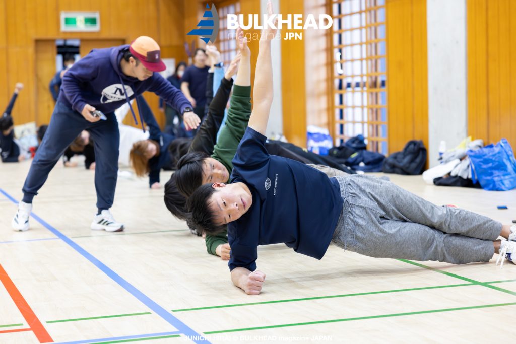 帰着後は当日の練習量に合わせた陸上トレーニングが行われます。パリ五輪まで49erチームのトレーナーを務めた篠田昌吾さんが、セーラーに特化したメニューでトレーニングします