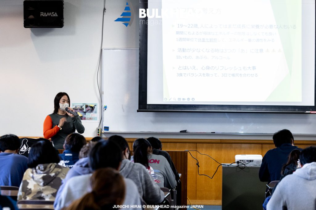 2日目の午前中には管理栄養士でもある冨部柚三子さんによる講習が行われました。内容は、試合期、練習期、オフ期の食事をアドバイスする「競技力を変える食事戦略」です