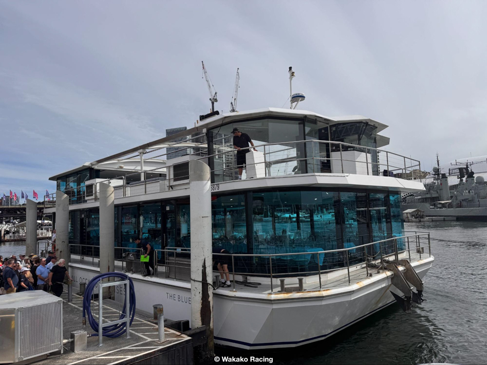 ちなみに、私が今回利用したフェリーはSailGP公式の観戦ボートではなく、フェリー会社が独自に運航している観戦クルーズです。食事とドリンク込みで1人160ドル。公式の観戦ボートは350ドル以上するので、かなり手頃な価格です。少しレース海面から遠くなるものの、海上での体験としては満足しました。