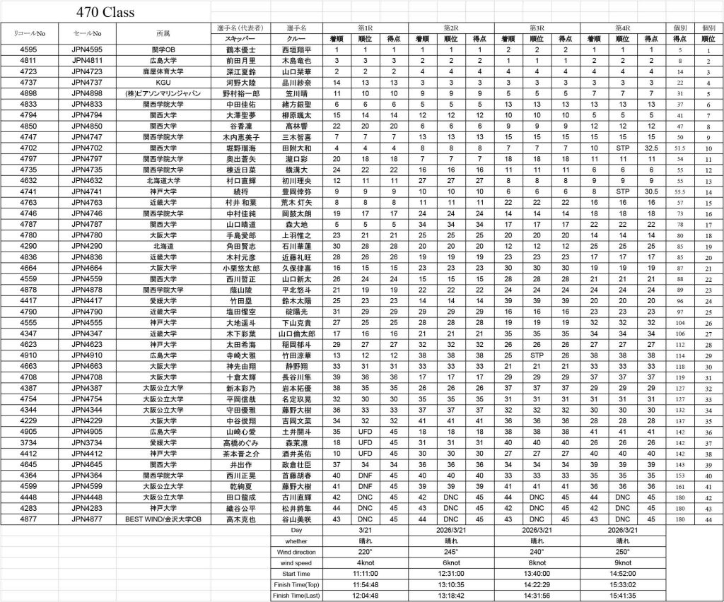 2026年度3月 関西学生ヨットオープンレガッタ 470最終成績