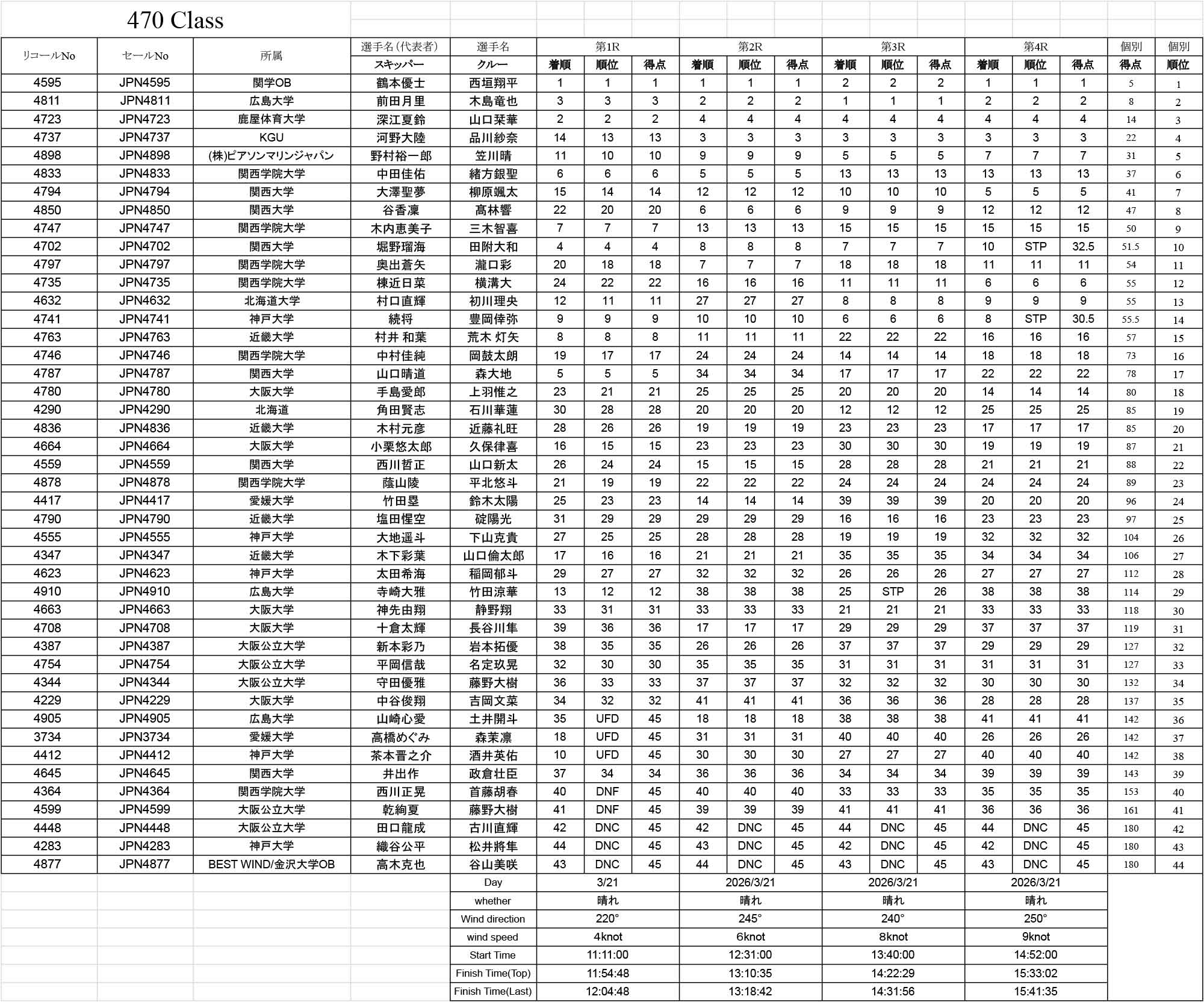 2026年度3月 関西学生ヨットオープンレガッタ 470最終成績
