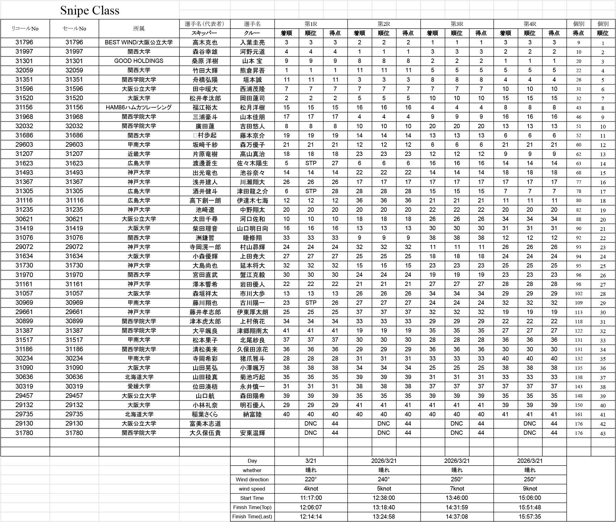 2026年度3月 関西学生ヨットオープンレガッタ スナイプ最終成績