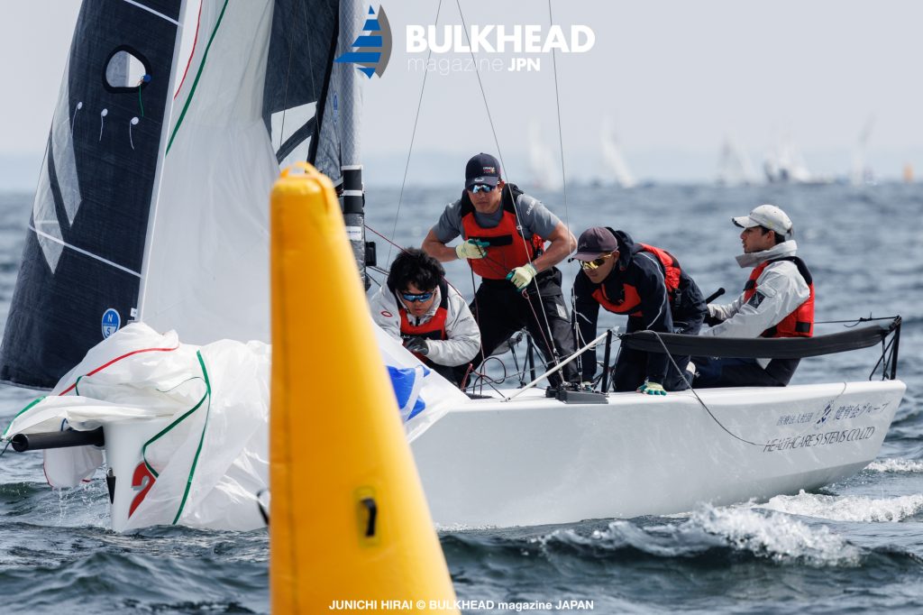 〈Contious〉に迫るのは、キールボートチームの若手メンバーで構成された〈Gaia〉(須田智也ヘルム)、そして葉山マリーナヨットクラブの有友 完会長が舵を取る〈Gimlet〉。また、過去に全日本を数回制し、優勝候補筆頭の〈Trinity〉(加藤高裕ヘルム)が、第3レースでバウポールを損傷したためリタイアしたことから、優勝争いは混沌となりました。